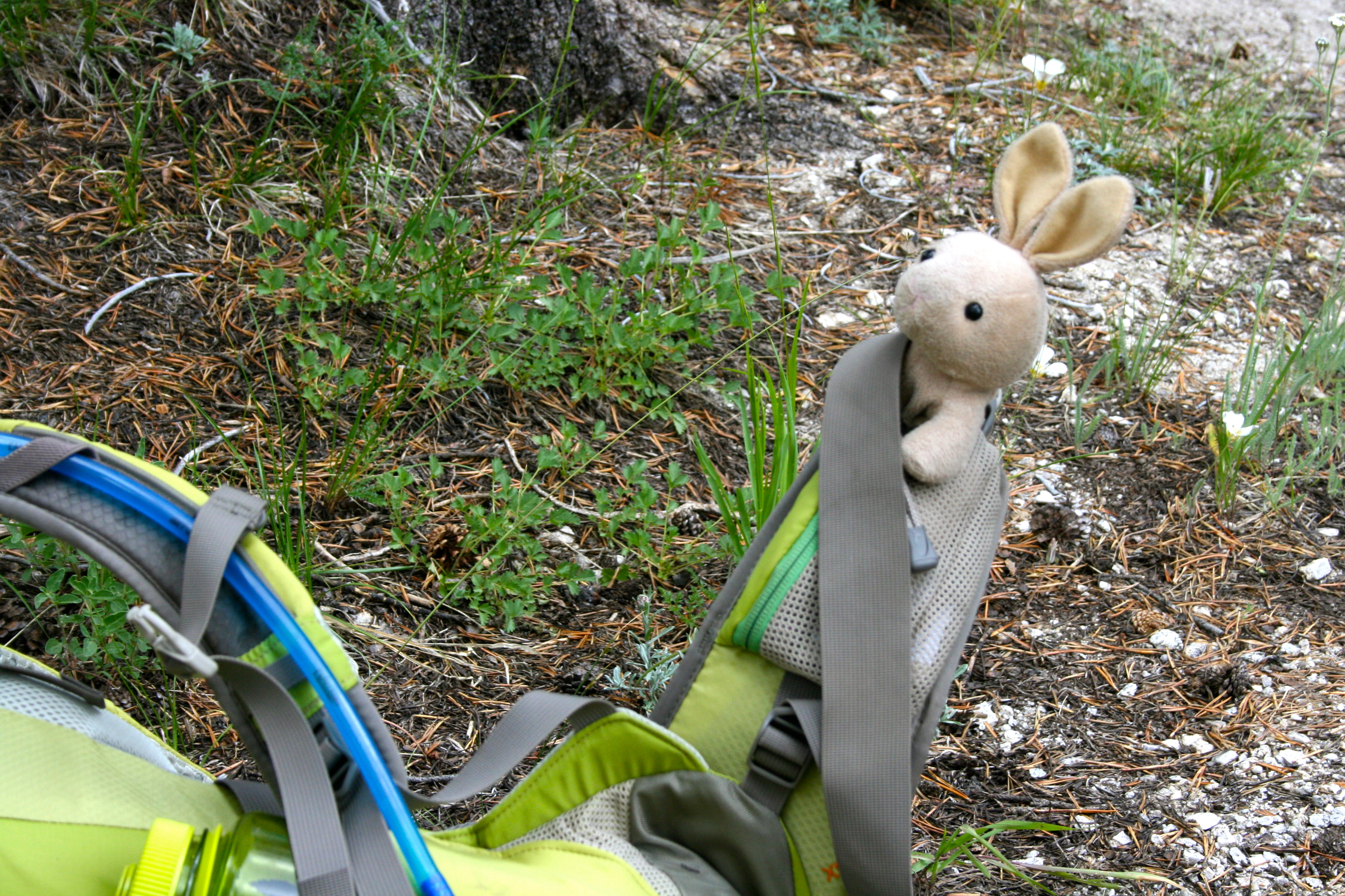 The next morning: I really didn't have to hike much... usually I just hitched a ride in my Mimi's backpack. She was nice to let me come along.